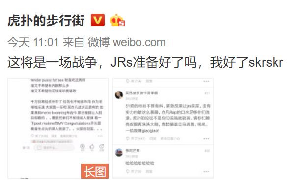 官博也毫不示弱。7月25日中午,微博@虎扑的步行街 发出了挑衅:“这将是一场战争,JRs准备好了吗,我好了skrskr”。