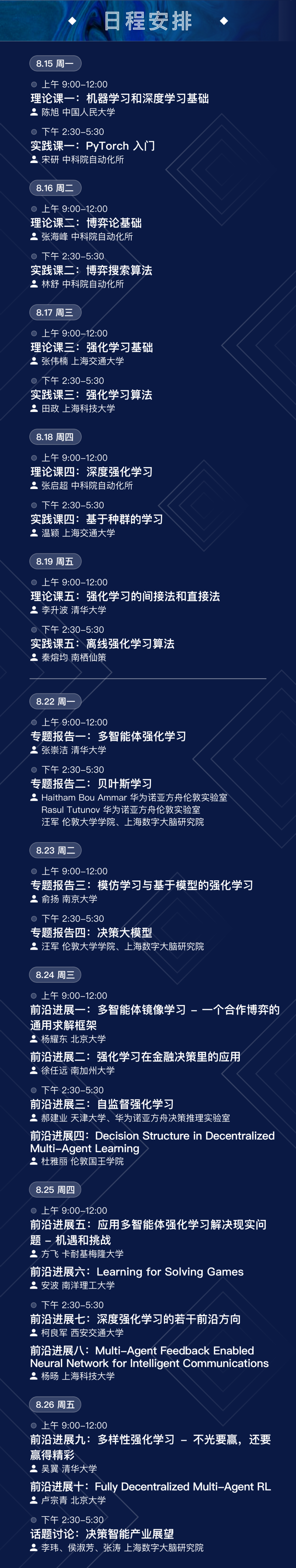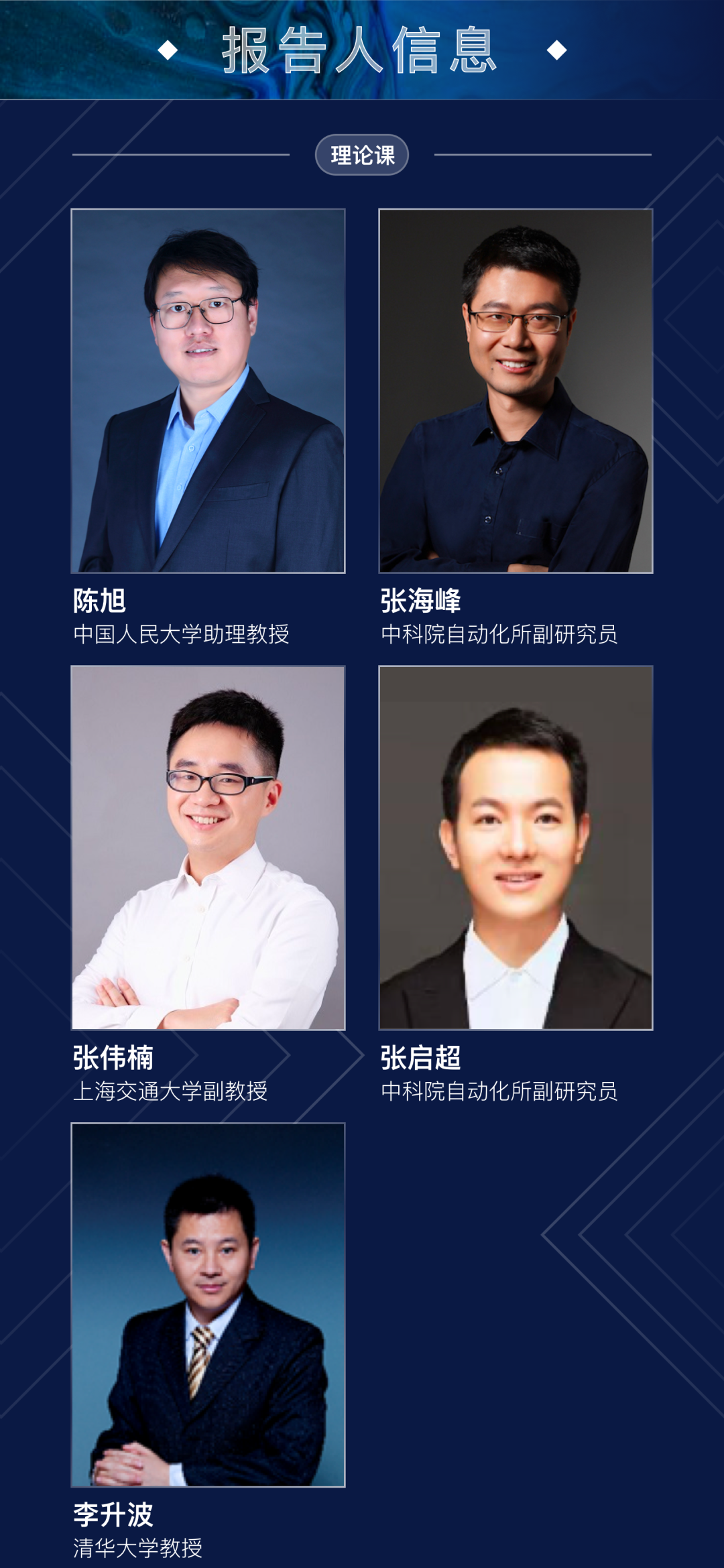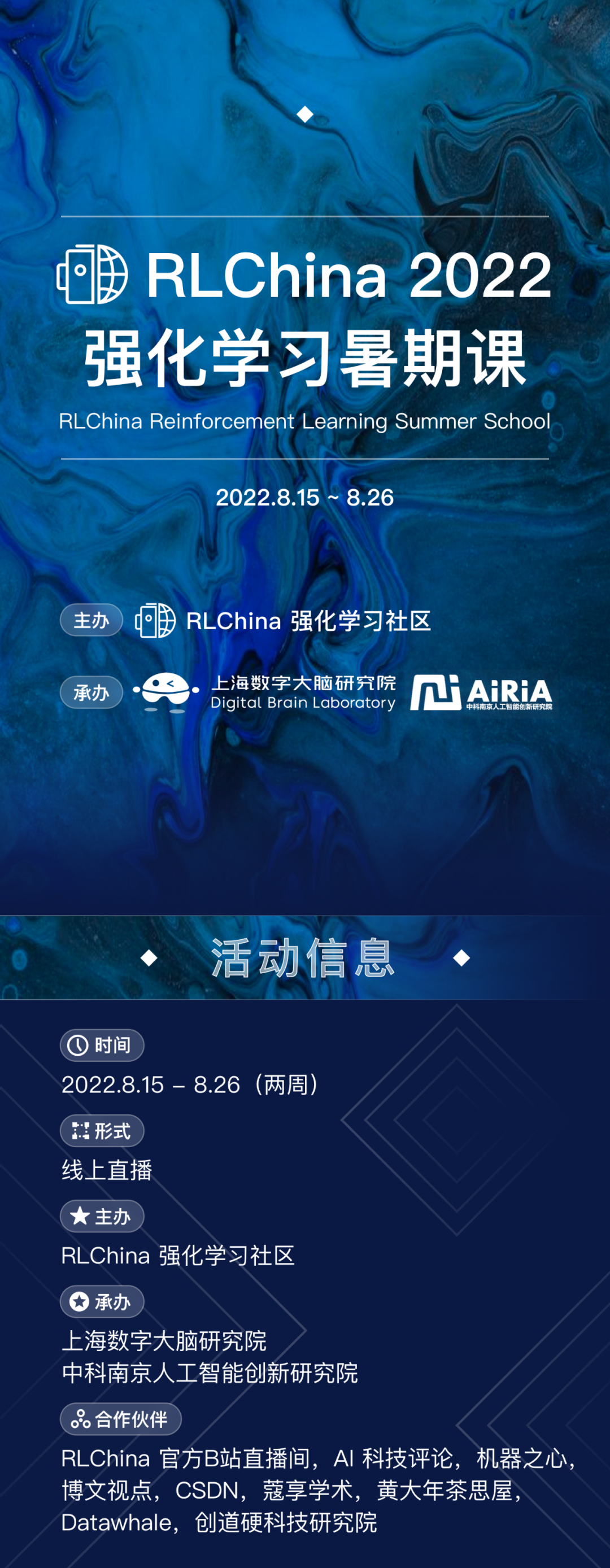 RLChina 暑期课是由国内外顶尖高校、企业老师们联合分享给广大强化学习爱好者的免费网络直播课程。RLChina 2022 强化学习暑期课为期两周,分为理论课、实践课、专题报告、前沿进展、产业展望5个部分。在保持学术前沿性的同时,强化了教学和实践属性,希望能给更广泛的爱好者带来帮助。
