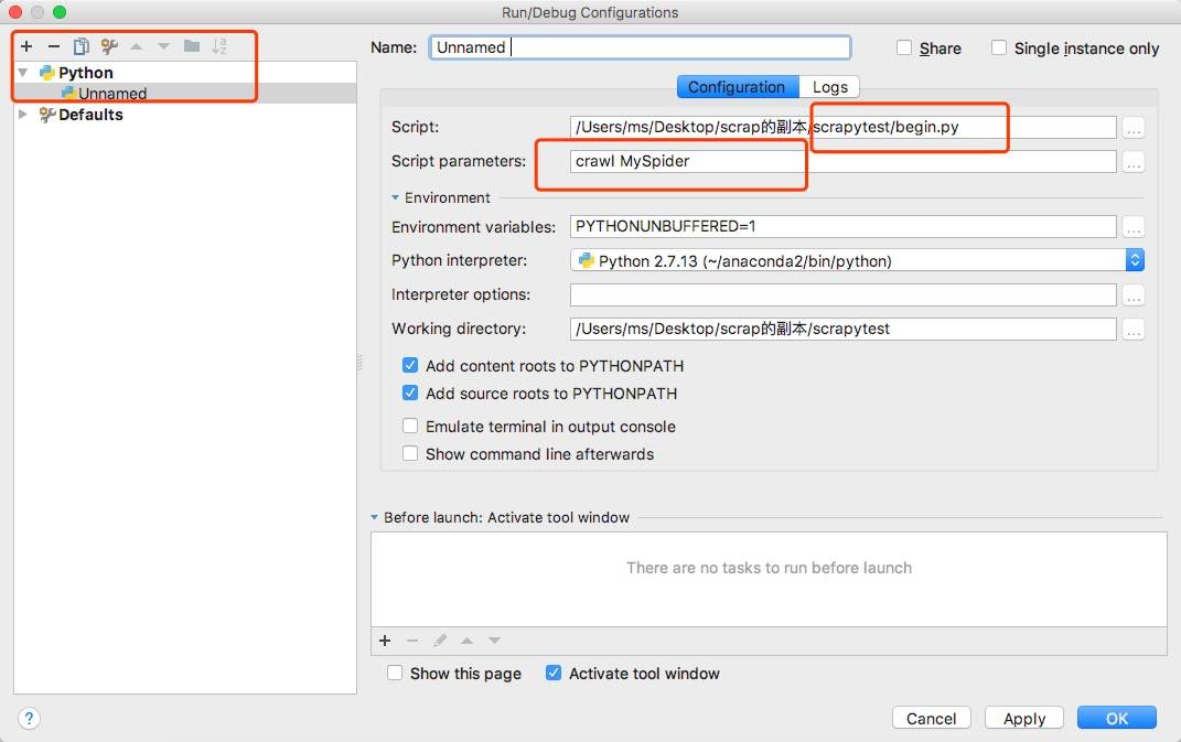 Script parameters 框 填入crawl MySpider ,其实就是crawl +爬虫名字,其他配置选项默认,点ok,就可以运行爬虫了。
