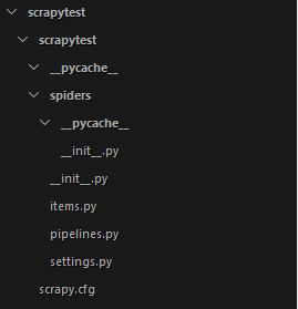 这里的scrapytest是工程名框架会自动在当前目录下创建一个同名的文件夹,工程文件就在里边。