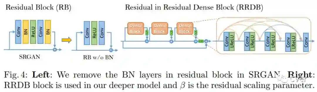 A.Network Architecture:: 1) remove all BN layers; 2) replace the original basic block with the proposed Residual-in-Residual Dense Block (RRDB)