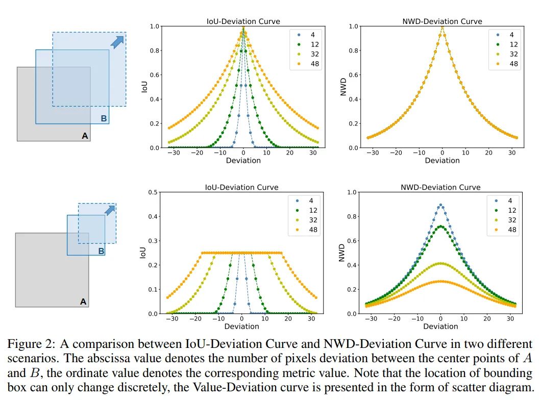 具体来说,对于 像素的小目标,轻微的位置偏差会导致明显的loU下降(从0.53下降到 ),导致 标签分配不准确。然而,对于 像素的正常目标,loU略有变化(从0.90到 ),位置偏差相同。此外,图2给出了4条不同目标尺度的loU-Deviation曲线,随着目标尺度的减小,曲线下降速度更快。值得注意的是,loU的敏感性来自于BBox位置只能离散变化的特殊性。