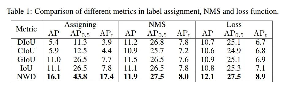 Table-1可以看出,与IoU指标相比,NWD的AP最高达到16.1%,比DIoU高了9.6%,说明基于NWD的标签分配可以为小目标提供更高质量的训练样本。