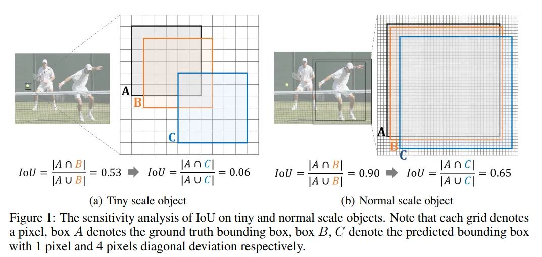 除了学习可判别特征外,训练样本选择的质量对于基于Anchor的小目标检测器来说也很重要,其中正/负标签的分配至关重要。然而,对于小目标,少量像素的属性会增加训练样本选择的难度。从图1可以看出,IoU对不同尺度的物体的敏感性差异很大。