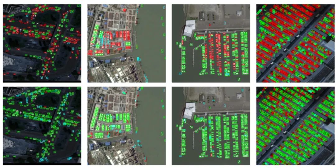 AI-TOD数据集上基于IoU的检测器(第1行)和基于NWD的检测器(第2行)的可视化结果上图所示。可以观察到与IoU相比,NWD可显著降低假阴性(FN)。