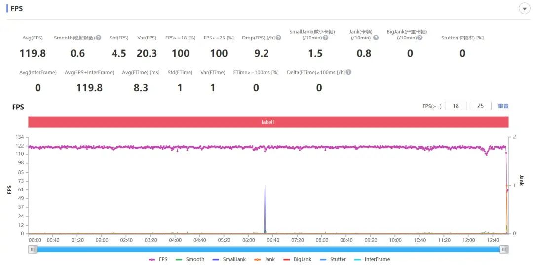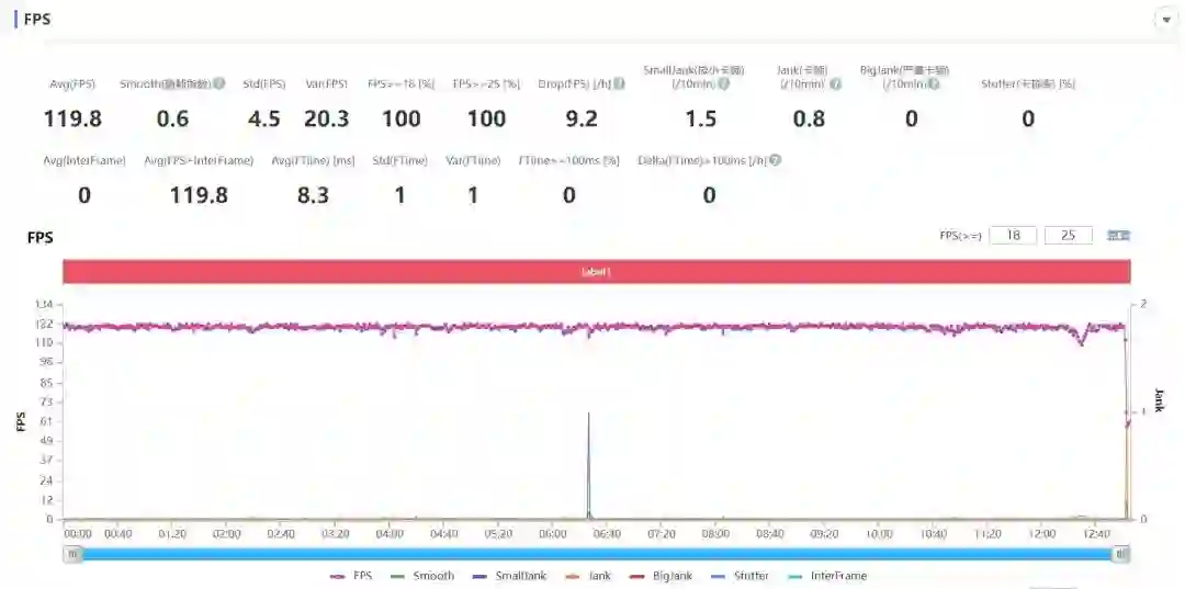 已知在室温为 24℃,且小米12S Ultra 开启性能模式之下,该机运行 20 分钟的极致画质《原神》时,可以带来 59.8 平均帧数;在面对极高帧率(120Hz)和高清画质的《王者荣耀》时,该机一场 12 分钟左右的匹配赛事中,可以带来 119.8 平均帧数。两款游戏在面对最极限的画质和帧率时,均带来了几乎满分的成绩,这一点很难不归功于台积电在温度和性能上的均衡输出。