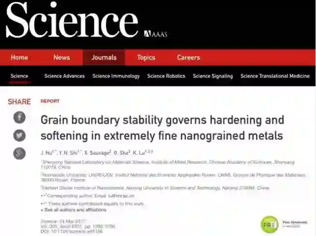 就在今年的3月24日,Science在线发表了卢柯的一项全新研究成果。研究发现通过适当合金元素的晶界偏聚可以提高晶界稳定性,从而可以大幅度调控纳米金属的强度。这一发现揭示了纳米材料中软化和硬化行为本质,澄清了过去三十多年来关于这一问题的争论。