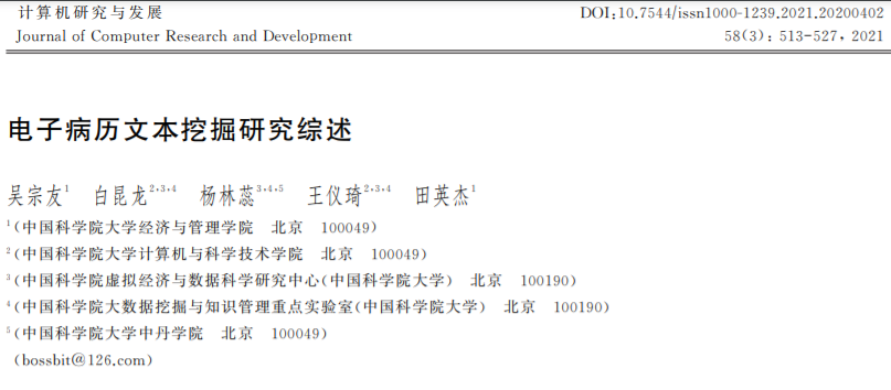 摘要: 电子病历是医院信息化发展的产物, 其中包含了丰富的医疗信息和临床知识, 是辅助临床决策和药物挖掘等的重要资源.因此, 如何高效地挖掘大量电子病历数据中的信息是一个重要的研究课题.近些年来, 随着计算机技术尤其是机器学习以及深度学习的蓬勃发展, 对电子病历这一特殊领域数据的挖掘有了更高的要求.电子病历综述旨在通过对电子病历研究现状的分析来指导未来电子病历文本挖掘领域的发展.具体而言, 综述首先介绍了电子病历数据的特点和电子病历的数据预处理的常用方法;然后总结了电子病历数据挖掘的4个典型任务(医学命名实体识别、关系抽取、文本分类和智能问诊), 并且围绕典型任务介绍了常用的基本模型以及研究人员在任务上的部分探索;最后结合糖尿病和心脑血管疾病2类特定疾病, 对电子病历的现有应用场景做了简单介绍.