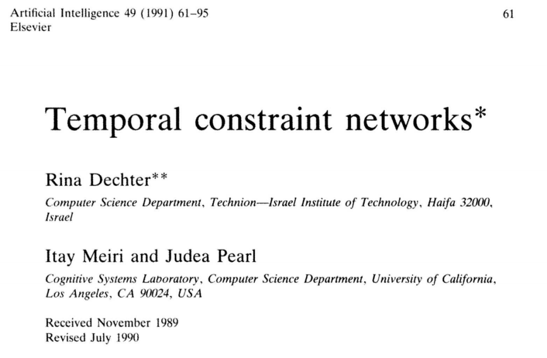 这篇论文发表于 1991 年,涉及的主题是上世纪八十年代的热门话题——时间约束。目前,该论文在谷歌学术上的被引用次数接近 2500。论文一作 Rina Dechter 被认为是「深度学习」一词的首倡者。