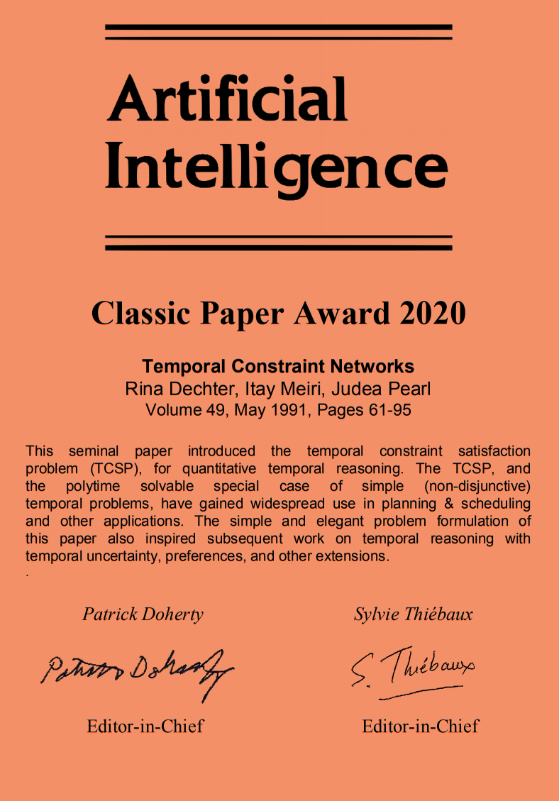 在论文《Temporal Constraint Networks》发表的同年,Rina Dechter 获得了美国国家科学基金会颁发的总统青年研究者奖。
