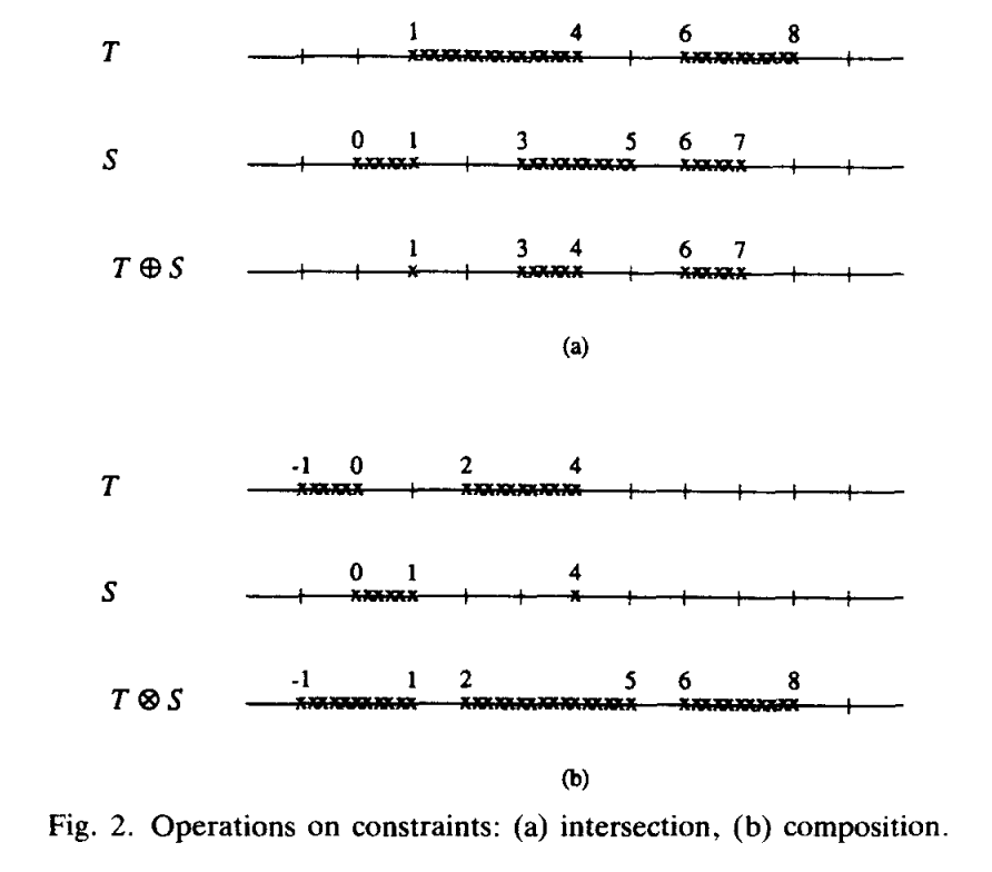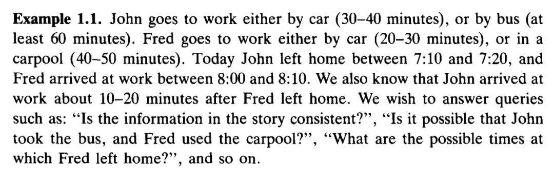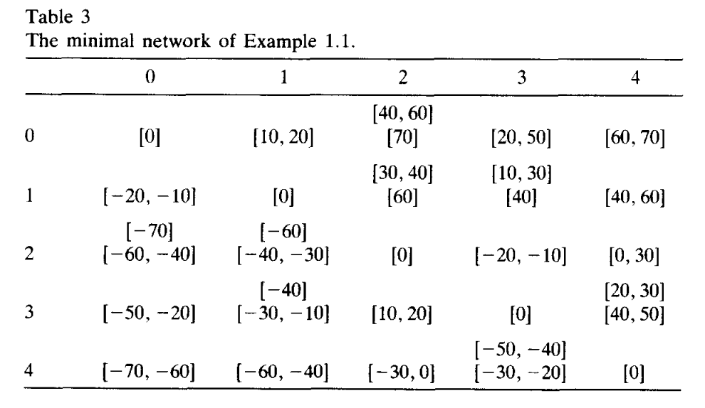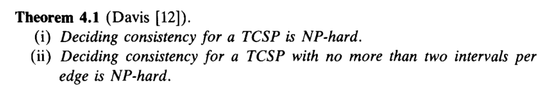 。在这个叫做时间约束满足问题(TCSP)的框架中,代表时间点和时间信息的变量由一组一元和二元约束进行表示,每一个指定一组时间间隔。该框架的独特特征在于允许处理度量信息,即评估不同事件之间的时间差。