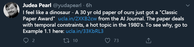 Judea Pearl 及其学生的思想经过了时间的洗礼,在 30 年后重新获得认可。对此,Pearl 调侃说,「感觉自己像只恐龙」。也许,这正是投身于科学研究的魅力所在。