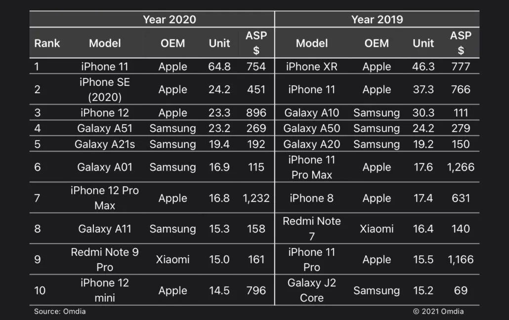 结果,仿佛来自上个十年的 iPhone SE 2 成为了一匹黑马,成为 2020 年第二畅销的手机,仅次于 iPhone 11,小胜首尝 5G 的 iPhone 12。