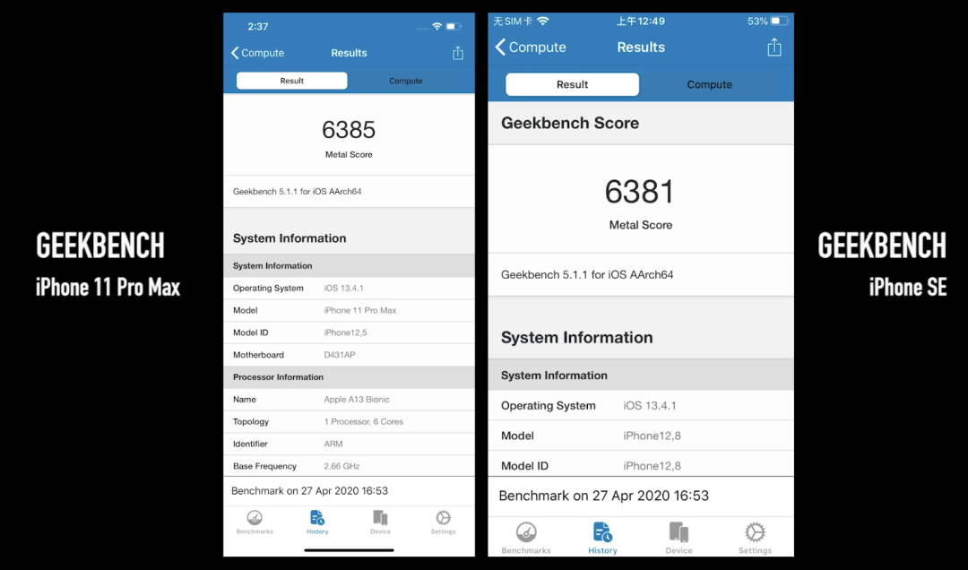 它最大的也几乎是仅有的亮点,就是 iPhone 11 同款的 A13 处理器,没有降频率没有砍核心,跑分也十分相近。在这一点上,iPhone SE 2 比后来的 iPhone 13 和 iPad mini 都要更良心,堪称买处理器送手机。