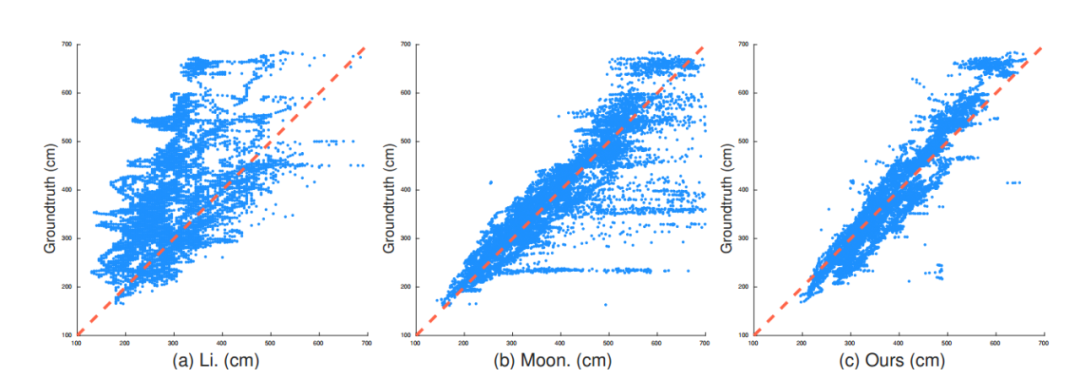 另外,我们对不同可选的深度估计方法进行了对比。第一种,回归全图的深度[1],如图第一列;第二种,根据检测框的尺寸回归人体深度[2],如图第二列。散点图的横坐标为人体深度估计值,纵坐标为实际值,散点越靠近 x=y 直线说明回归的深度越准确。可以看出,我们提出的方法(Root Depth Map)具有更好的深度一致性和泛化能力。