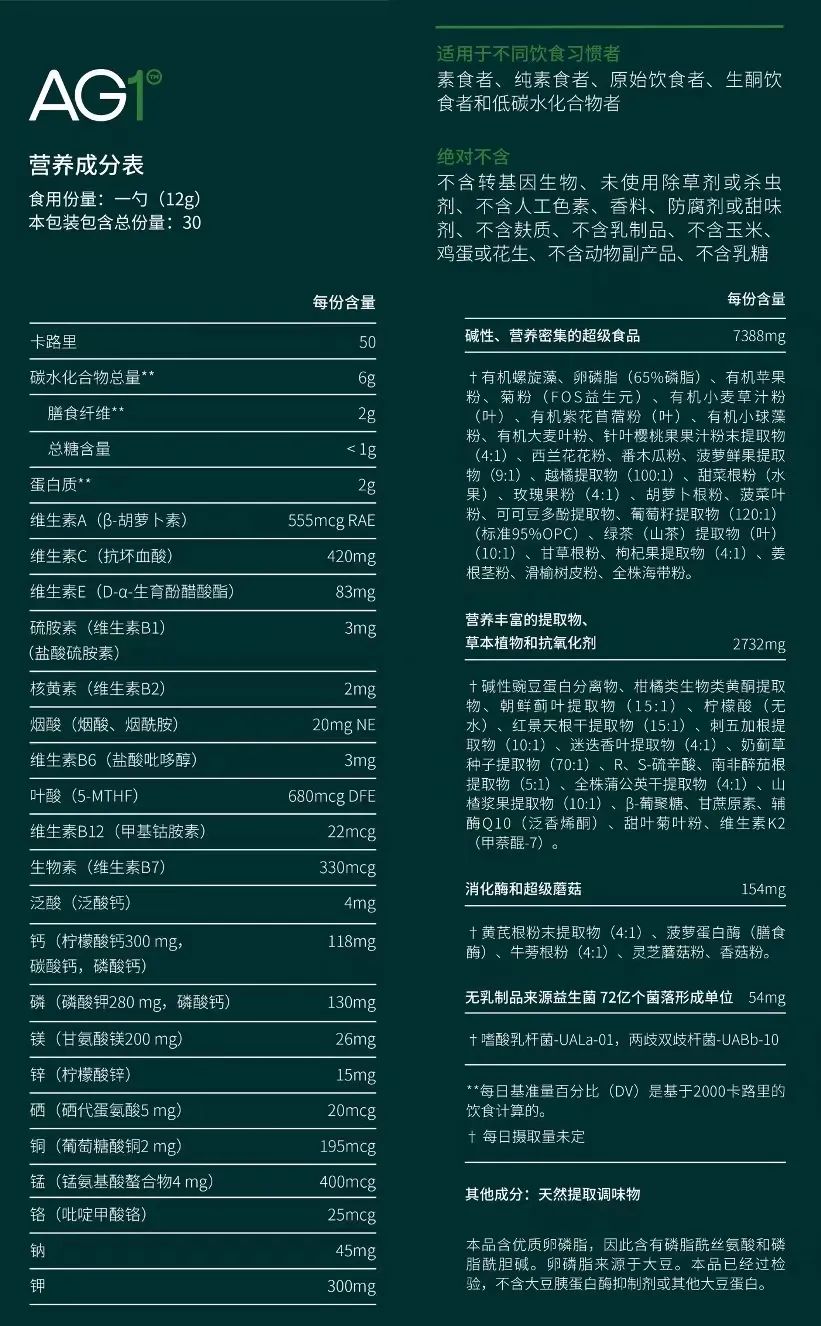 AG国际官网提到,这款产品拥有75种关键营养,包括维生素、益生菌、矿物质、消化酶以及植物适应元等。这不是功效的简单堆砌,而是考虑到营养素之间的协同作用,经过12年时间摸索出来的最佳组合。