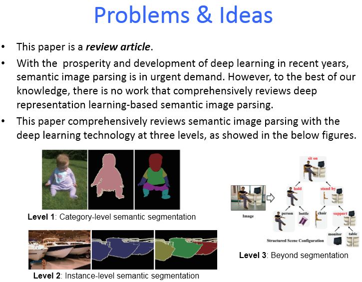图像语义解析是指将图像分解为语义区域,并构造出输入图像的结构化表示的过程。近年来,它已在计算机视觉领域引起了人们的广泛兴趣。深度表达学习的近期应用促使图像语义解析进入一个新的发展阶段。本文总结出图像语义解析研究进展的三个方面,即:类别级语义分割、实例级语义分割,以及超越分割。具体来说,我们首先回顾每个任务的通用模型框架,并介绍它们相关的变体。继而,我们讨论每种方法的优点和局限性。此外,我们还全面比较不同的基准数据集和评估指标。最后,我们进一步探讨图像语义解析的未来发展趋势和面临的挑战。