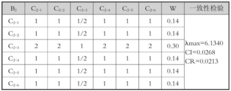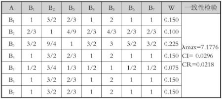 采用同样的方法,首先根据矩阵B的数值,得到二级指标的W0值;接着,算出W的归一化值;然后,形成二级指标 B1,B2,...,B7 的权重。