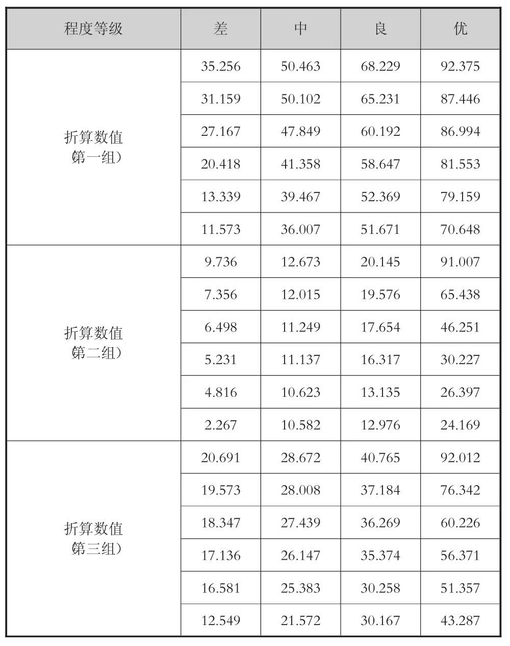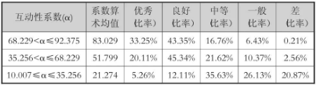 在计算出师生间互动行为的互动性系数之后,再将其作标准化百分制折算,进而得出0-100之间相应数值的数组形式。这里参照何晓群、刘文卿在《应用回归分析》一书中采用的分位数法模式,将互动性系数折算值对应的程度等级,依次定义为优、良、中与差4个等级。各组程度等级及部分对应数值,如表6所示。