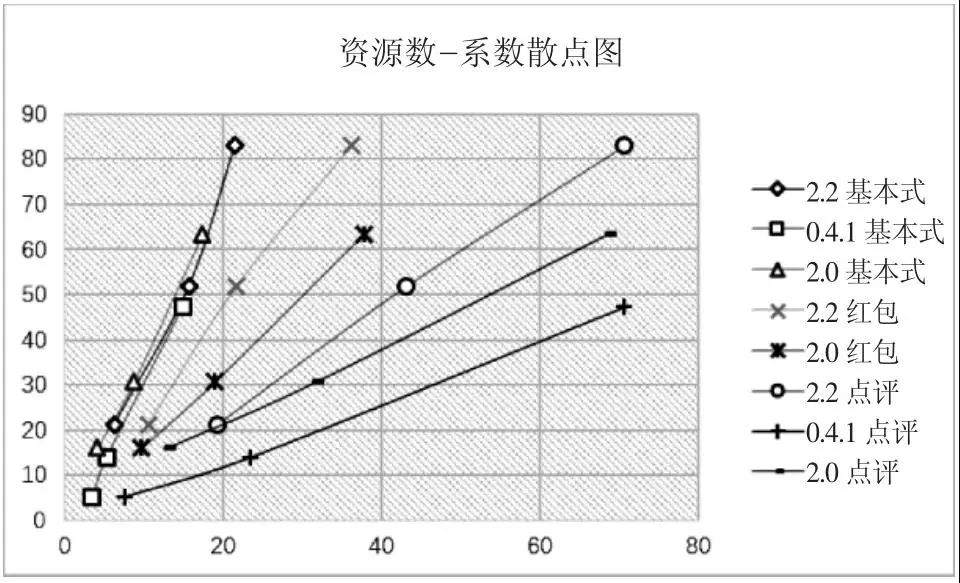注:横坐标为资源数;纵坐标为互动性系数均值。2.2基本式,即“雨课堂”V2.2的基本要素式资源数与互动性系数均值的函数平滑线,其他类似;“翻转课堂”V0.4.1无红包激励项,故没有平滑线显示。