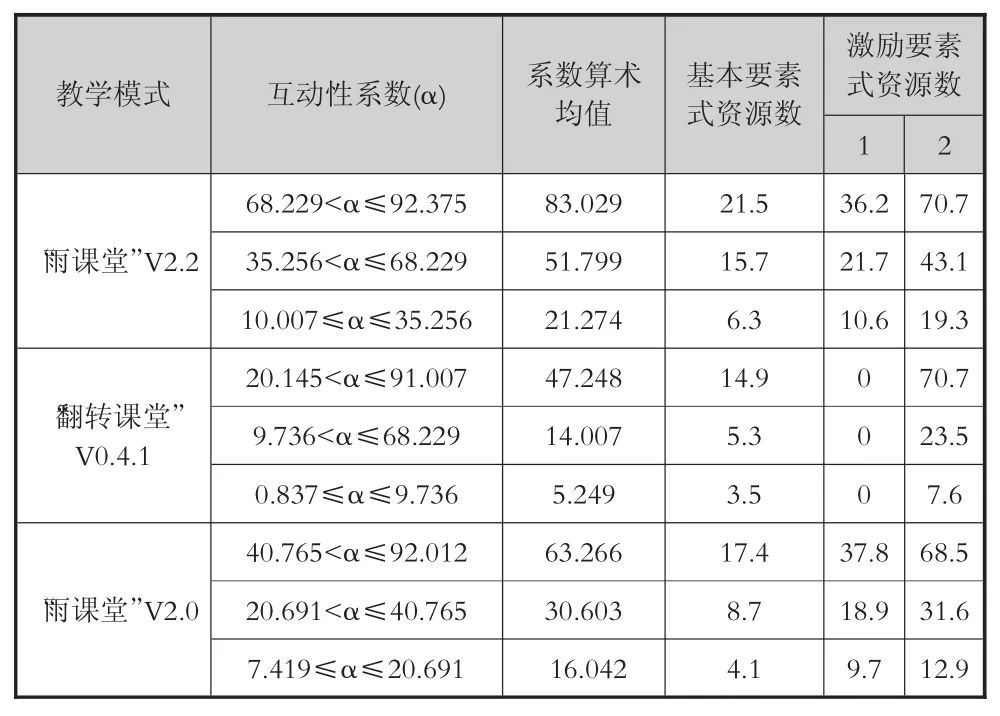 从微观数值层面深度解析,上述逻辑关系可得到以下更有说服力的客观数据支撑:以 “雨课堂”V2.2数据为样本,当互动性系数算术均值为83.029(系数值为:68.229<α≤92.375)时,任课教师分享的慕课、微课、网络视频等基本要素式在线教学资源数均值是21.5(每门课×学期×班级);课堂红包、点评数等激励要素式资源数则分别是36.2个和70.7个。“雨课堂”V2.2其余组位对应的数值、“翻转课堂”V0.4.1及“雨课堂”V2.0的相关佐证数据,经统一归集,如表8所示。