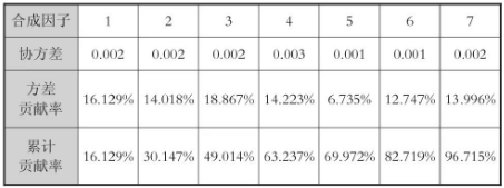 表2中协方差、方差贡献率及累计贡献率等相关数值显示:(1)7类合成因子累计贡献了原始特征指标96.715%的信息和能量,表明完整性比率较高;(2)协方差的数值均较小,反映了自身结构简洁、含义清晰、信息简明的特征;(3)协方差数值也反映合成因子间的重叠成分较少,相互影响效应较小。由此可见,IDCNN法所确定的合成因子,满足实证研究中的三个基本要求。