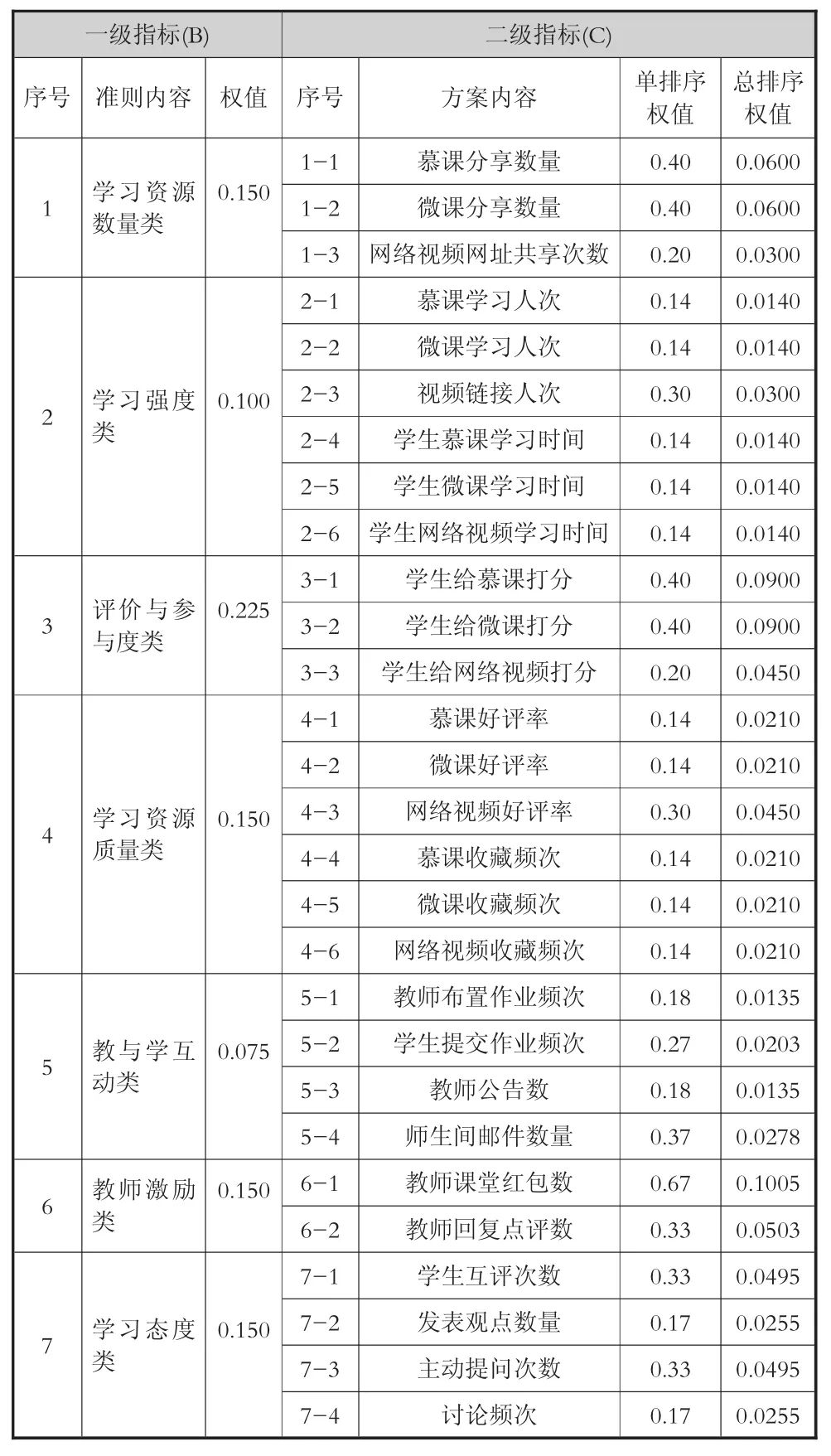 我们通过对各层次权重及具体互动行为特征的综合运算,并进行归一化处理后,得到师生间互动性行为的权重模型(表5)。为方便起见,模型中省略了第一层次的目标层(A层)。因此,准则层为7个一级指标(B层);措施层则由28个二级指标(C层)构成,具体如表5所示。