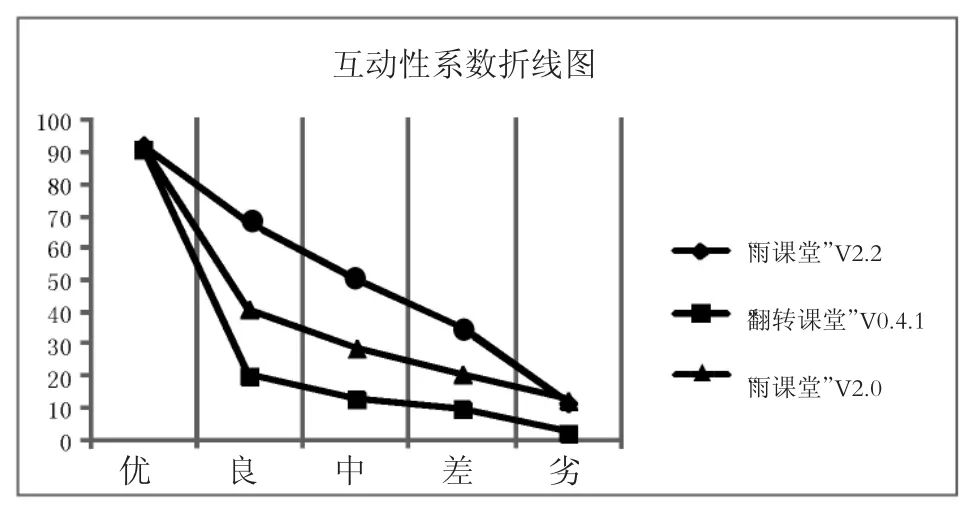 对 “雨课堂”V2.2、“翻转课堂”V0.4.1及 “雨课堂”V2.0的系数进行折算后,我们得出三组互动性系数值数组,分别用三种折线来表示,如图3所示。