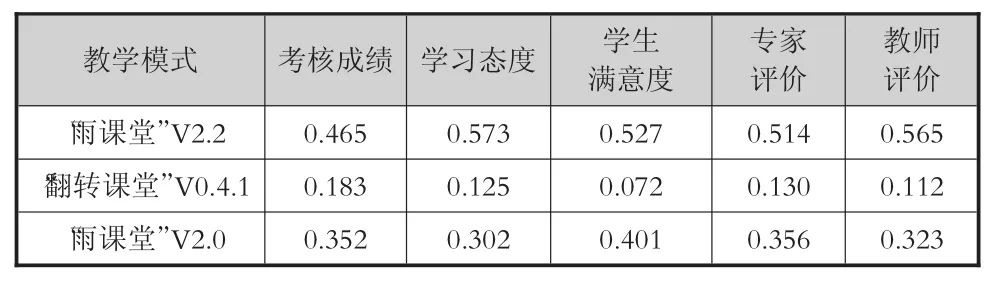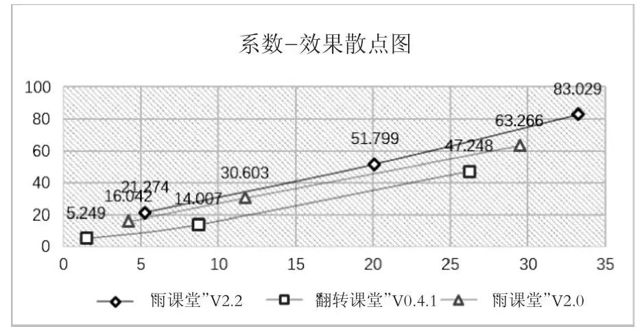 显而易见,教学效果和互动性系数对应的数值,满足以下规律或结论:(1)如果师生间互动性系数值越高,那么教学效果就越好;(2)从教学效果的具体指标数值来看,“雨课堂”V2.2的教学效果,明显高于其它两种教学模式,这恰好反证了只有高水平的互动性行为,才能更高效地正向影响智慧课堂的教学效果。