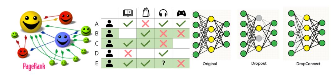 图1:机器学习与深度学习中关系建模的不同体现,即网页检索中不同网页之间的关系、推荐系统中用户和商品之间的关系、神经网络中不同节点之间的关系。