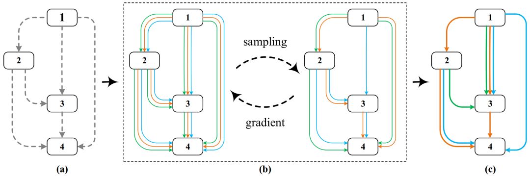 在网络结构学习中,我们将不同层之间的关系看作是一个选择不同层之间操作的多分类问题。由于类别数目无法确定,我们提出了集成的Gumbel-Softmax来搜索高性能的网络结构。由于Gumbel-Softmax可以有效并高效地用一种可微的方式来优化离散空间结构。我们集成的Gumbel-Softmax方法也可以保证搜索过程的可微性,并且可以最大化地保证网络结构在训练和测试过程中的一致性,使得模型的性能和效率可以同时得到可观的提升。算法流程图如下图所示。