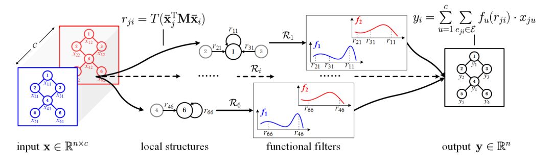 由于局部输入的无序性和维度的可变性,传统卷积网络很难处理这种处于非欧几里得空间的数据。为了解决这个问题,时空大数据处理团队(STDAL)的常建龙博士、向世明研究员、潘春洪研究员等人提出了结构感知卷积神经网络来处理一般结构的数据,而不是仅局限于处理欧氏空间的数据。根据“数据=特征+结构”的基本假设,我们对传统卷积做了两个泛化来达到以上目的。第一,将离散的有限维卷积核泛化为连续的无穷维卷积核,即单变量函数;第二,将结构信息建模到卷积中。算法流程图如下图所示。大量的实验证明,结构感知卷积网络可以高效地在GPU上处理各种基于不同结构数据的任务,例如,图像分类和聚类、交通流量预测、分子活性预测等等。