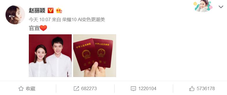 【 CSDN 编者按】风雨之后见彩虹,分手季之后就是喜讯季。时针拨到了今晨的 10 点 07 分,演员赵丽颖和冯绍峰同时发了一则微博,正式向公众官宣: