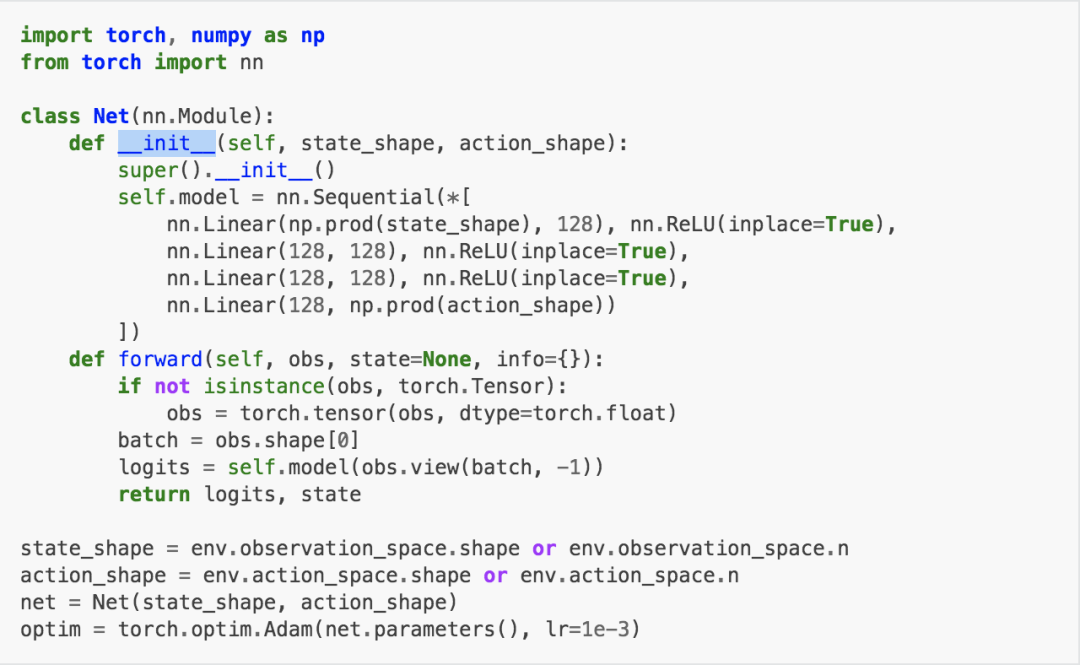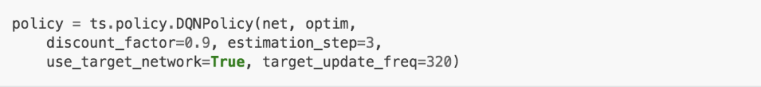 我们使用已定义的net和optim(有额外的策略超参数)来定义一个策略。下方我们用一个目标网络来定义DQN算法策略。