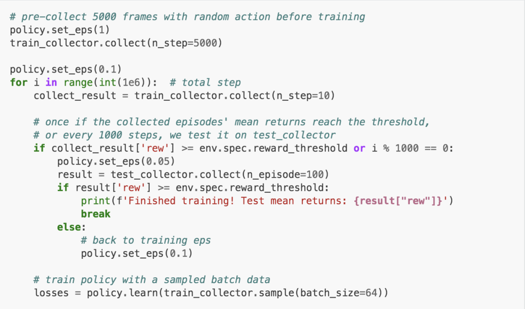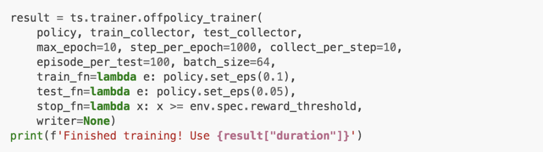 天授提供了训练函数onpolicy_trainer和offpolicy_trainer。当策略达到终止条件时,他们会自动停止训练。由于DQN是无策略算法,我们使用offpolicy_trainer。