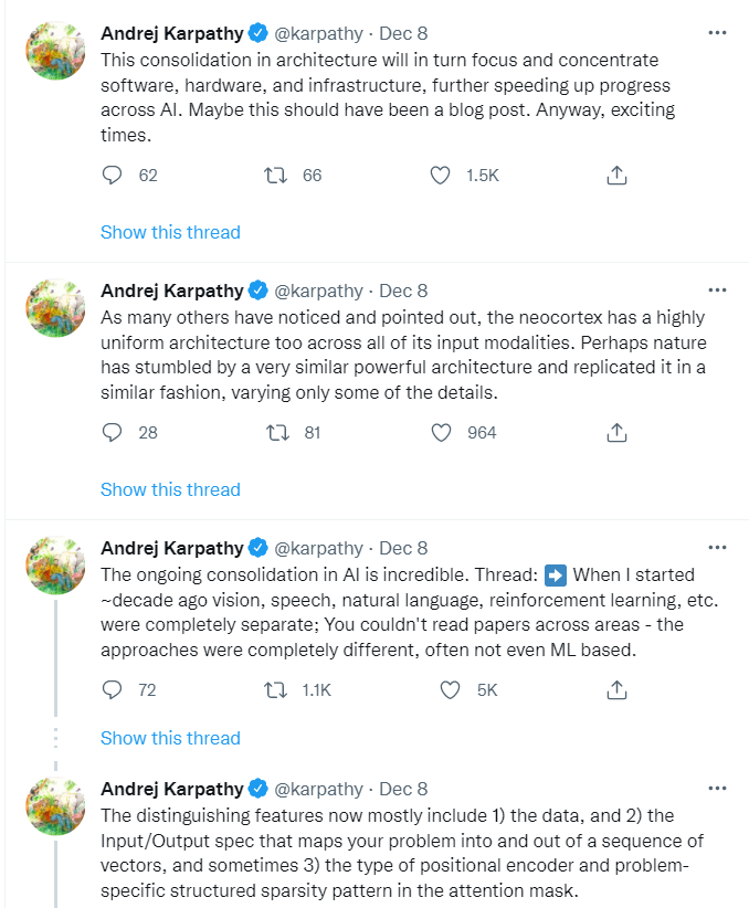 虽然在技术上,我重点聚焦视觉领域,但所有人工智能领域的论文、人和想法都突然变得非常相关。每个人都在用基本相同的模型工作,所以大多数改进和想法,可以在所有人工智能领域迅速"复制粘贴"。正如许多人已经注意到并指出的,大脑皮层对其各种输入模式也有一个高度统一的架构。也许自然界也碰巧找到了一种类似的强大架构,并以类似的方式进行着复制,只在细节稍微做出些变化。这种架构上的整合,会反过来聚合和集成软件、硬件、基础设施,并进一步加快整个人工智能的进展。总之,这是个令人兴奋的时代。