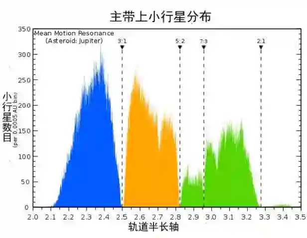 再举个例子,太阳系在火星和木星之间有众多的小行星,形成一个小行星带。已发现并确认的就有几十万颗。这些小行星在太空中的分布和它们的轨道稳定性有密切关系。如果小行星绕太阳的运动周期和木星的周期比例是有理数,这就形成共振,它们之间的相互影响就会很大,这些影响往往会导致小行星轨道的不稳定。因此,在这些轨道上小行星的数目就会很少。小行星分布的著名Kirkwood空隙就是在这些共振区域。比较大的空隙是3:1、5:2、7:3和2:1等共振区域。