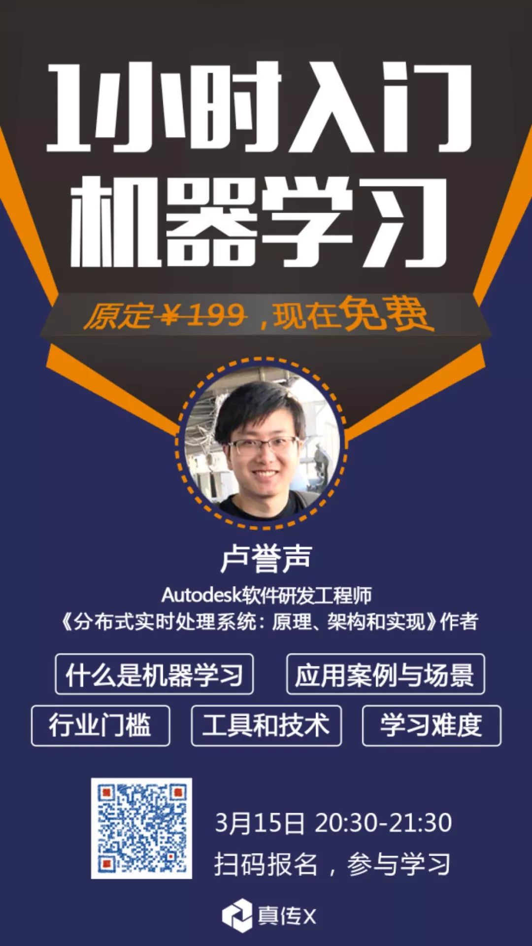 为了让各位小伙伴更好的入门人工智能和机器学习,我们邀请到卢誉声老师,在3月15日20:30 - 21:30带大家“1小时入门机器学习”。