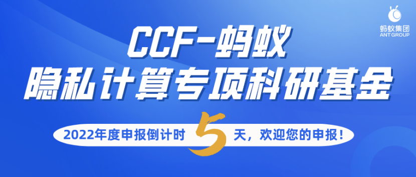 “CCF - 蚂蚁隐私计算专项科研基金”申报还剩最后 5 天,欢迎海内外优秀学者提交项目申报书。我们将在“2022 世界人工智能大会上举办的可信隐私计算高峰论坛“上进行基金项目的颁奖仪式。