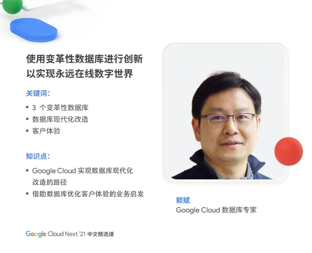 Google Cloud Next '21 中文精选课将于 11 月 16 日上午 11:30 ,在谷歌开发者大会专题演讲区正式开课!6 位 Google Cloud 技术专家,将聚焦"基础设施、应用现代化、AI、数据分析、数据库" 5 大话题,剖析前沿技术,分享最佳实践案例,探讨未来发展趋势。