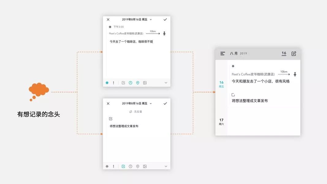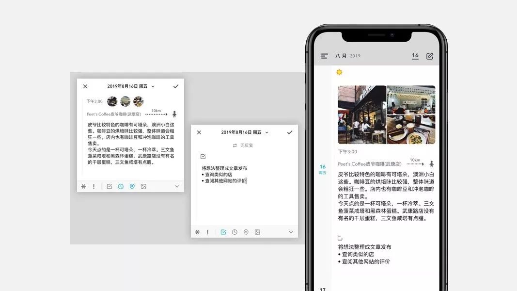 到晚上写日记的时候,再打开笔记,在日记下做细化的填写。添加拍的照片、当时的具体感受,方便以后的回顾。再针对 Todo 待办的部分,整理接下来需要做的事,如查询一些类似的咖啡店、查阅下其他点评网站的评价等等。这样一来,一天的日记就安排上了,满满当当。从随手的笔记,到细化的日记,比原先写日记的压力小多了。