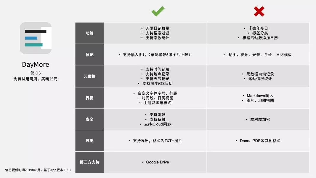 作为一款日记 App,当然是要考虑长期使用下去的。参考《为什么 Day One 是最好的日记应用 | Best Of》对日记App 评价纬度,总体来说,DayMore 的功能介于完全免费梯队与收费梯队的水平之间。对于入门使用日记 App 的用户来说已经足够,不需要太多的时间学习和折腾,同时也能满足一些个性化的需求。但目前 DayMore 在可添加的内容形式和导出方式上,还比较薄弱。与 Day One 对比功能目前大多数的日记应用都采用订阅制来收费,如 Day One Premium 账户的年费是 34.99 美元。DayMore 则是买断制,目前价格为人民币 25 元,提供 2 周的免费体验时间(期间不包含字体功能,不过完全不影响使用)。担心自己不能坚持写日记的话,可以先用这两周的时间试一试。