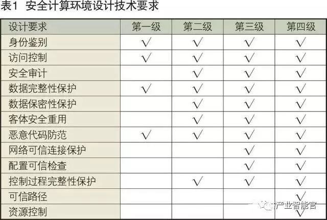 安全计算环境,包括工业控制系统0~3层中的信息存储、处理及实施安全策略的相关部件。安全计算环境按照保护能力划分为第一级安全计算环境、第二级安全计算环境、第三级安全计算环境和第四级安全计算环境,安全计算环境设计技术要求逐级增强,各等级要求如表1。