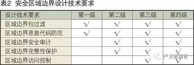 安全区域边界是指对定级系统的安全计算环境边界,以及安全计算环境与安全通信网络之间实现连接并实施安全策略的相关部件。安全区域边界按照保护能力划分为第一级安全区域边界、第二级安全区域边界、第三级安全区域边界和第四级安全区域边界,安全区域边界设计技术要求逐级增强,各等级要求如表2。