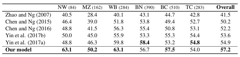 从结果中,我们不难看出,我们的方法是整体显著优于基准系统方法的在不同源的语料上测试,我们的方法能够在大部分来源的语料上超越基准系统,尤其是在文本数目最大的BC语料上,我们的方法优于所有的基准系统。综上所述,我们提出的基于强化学习的中文零指代消解算法能有效够提升中文零指代消解的效果。