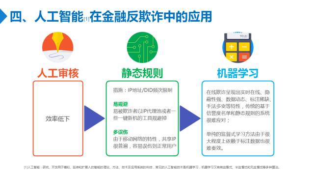 然而“魔高一尺,道高一丈”,金融反欺诈技术也在不断进化,并已进入人工智能时代。以机器学习为代表的人工智能技术致力于检测已知和未知模式的欺诈,以提高效率、降低成本、辅助人工做出对欺诈的响应和预防。