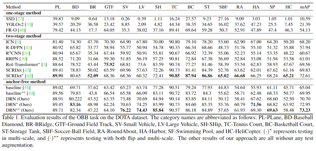 表1显示了DOTA测试集上比较。其他方法都是基于anchor的,并且大多数基于Faster R-CNN的框架。相比之下,本文的方法是anchor-free的。与baseline相比,本文的方法在mAP方面实现了3.3%的增长。