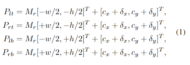 其中(cx,cy)和(δx,δy)是中心点和偏移量预测;(w,h)是尺寸预测; Mr是旋转矩阵;Plt,Prt,Plb和Prb是定向边界框的四个角点。按照CenterNet的回归任务,本文使用L1损失进行旋转角度的回归: