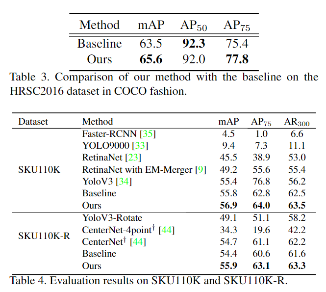 在这项工作中,采用CenterNet 并以一个额外的角度预测head作为baseline,并提出了动态优化网络(DRN)。具体来说,DRN由两个新颖的部分组成:功能选择模块(FSM)和动态优化head(DRH)。FSM使神经元能够根据目标对象的形状和方向调整感受野,从而将准确的去噪特征传递给检测器。DRH使模型能够以目标对象感知的方式进行灵活的推断。具体而言,本文提出了两种用于分类(DRH-C)和回归(DRH-R)任务的DRH。此外,还重新标记了SKU110K 的定向bounding box,并将其称为SKU110K-R,通过这种方式,有助于定向的物体检测。