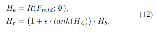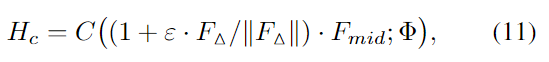 其中Fmid是通过对具有3×3卷积核的Conv-BN-ReLU块进行处理而得到的基本特征,*表示卷积算符。最后得到了分类预测Hc